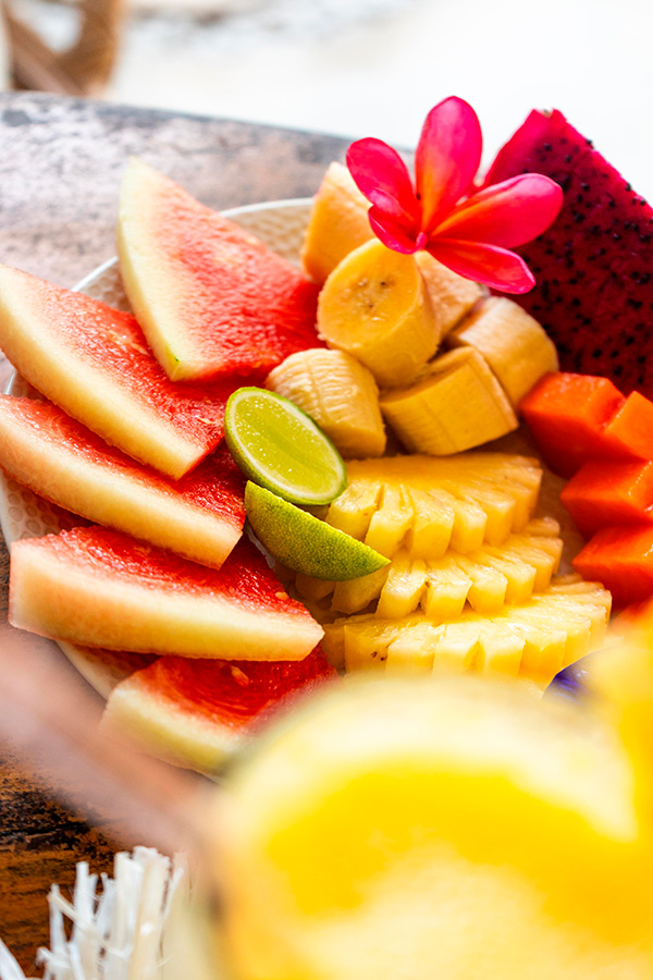 Outdoor swimming pool with palm trees and sunbeds, daily breakfast included, featuring fresh local fruits ,relaxed tropical atmosphere, free Wi-Fi, personalized attention in English, Spanish, and Indonesian.